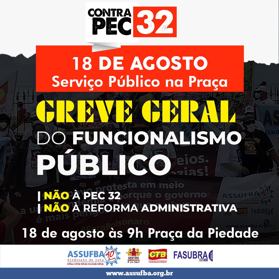 Os servidores públicos municipais, estaduais e federais devem se juntar à ASSUFBA na Greve Geral do Funcionalismo Público. Será um dia de protestos contra a Reforma Administrativa – PEC 32.