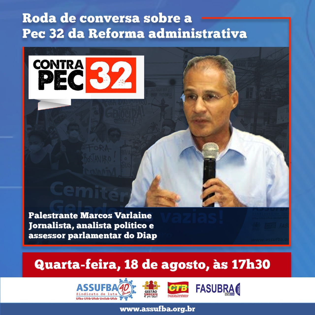 Como parte das atividades da Greve Geral do Funcionalismo Público, a ASSUFBA participa, nesta quarta-feira (18/08), às 17h30, da Roda de Conversa sobre a Reforma Administrativa. Quem vai falar sobre os prejuízos da PEC 32 é o jornalista, analista político e assessor parlamentar do Diap, Marcos Verlaine.