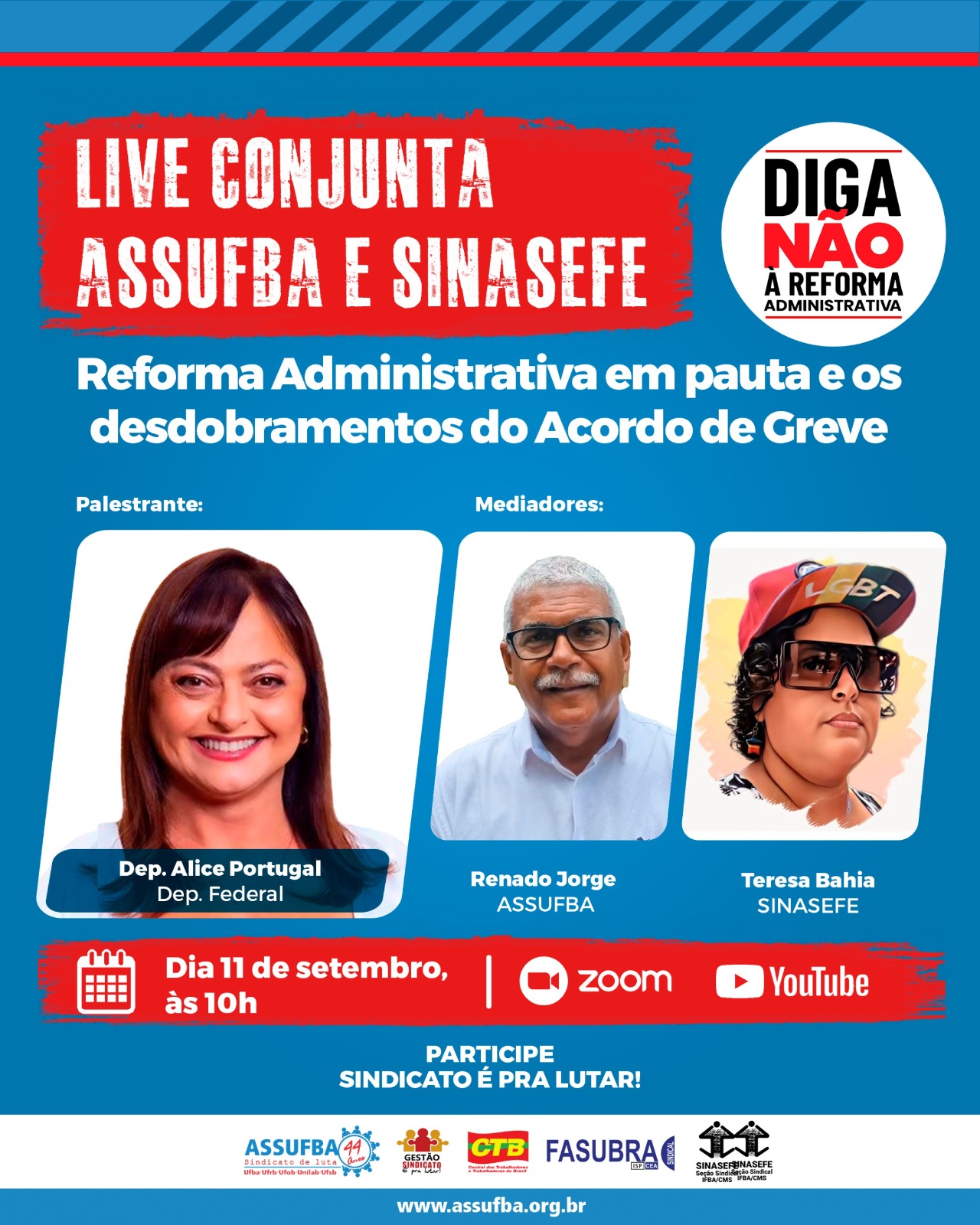 No dia 11 de setembro (quinta-feira), às 10h, acontece a Live Conjunta da ASSUFBA e do SINASEFE, que terá como tema a Reforma Administrativa e os desdobramentos do Acordo de Greve.