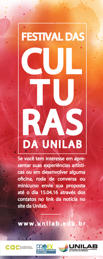 Estão abertas até o dia 15 de abril as inscrições para o I Festival das Culturas da Unilab. Os interessados em participar com números de dança, canto, interpretação, desenvolver oficinas ou apresentar algum projeto de extensão podem enviar suas propostas para o e-mail: festivaldasculturas@unilab.edu.br ou clique aqui para acessar o formulário de inscrição. Uma comissão vai verificar a viabilidade das propostas e incluí-las na programação.