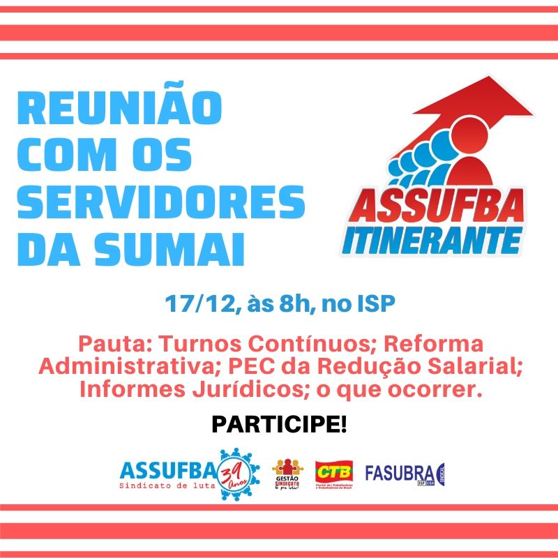 Amanhã (17): ASSUFBA-SINDICATO reúne servidores da SUMAI para tratar demandas da categoria