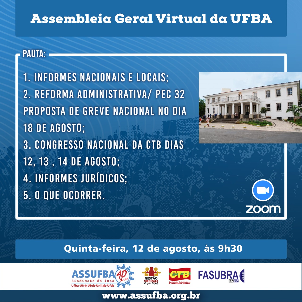 A Assembleia Geral será realizada pelo aplicativo Zoom. Os associados da ASSUFBA terão acesso à atividade realizando o preenchimento do formulário: https://url.gratis/gcTJXd