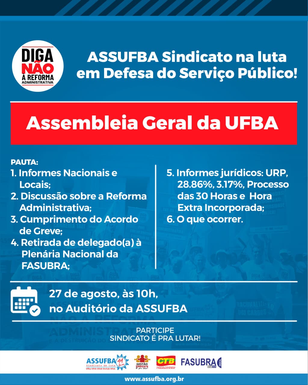 No dia 27 de agosto, às 10h, no Auditório da ASSUFBA, vamos debater as estratégias de luta contra a Reforma Administrativa e o desmonte do serviço público, além de reafirmar a defesa dos direitos da categoria, da soberania nacional e da democracia.