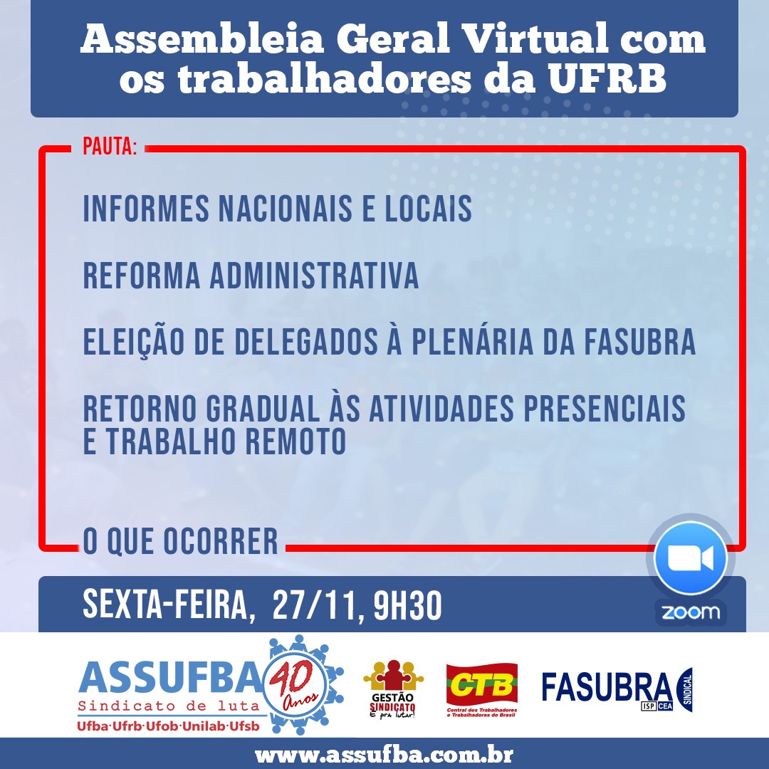 A Assembleia Geral Virtual com os trabalhadores da UFRB acontece nesta sexta-feira (27/11), às 9h30. A ASSUFBA debate com os servidores a seguinte pauta: Informes nacionais e locais; Reforma Administrativa; Eleição de Delegados à Plenária da FASUBRA; Retorno gradual às atividades presenciais e trabalho remoto; e o que ocorrer.