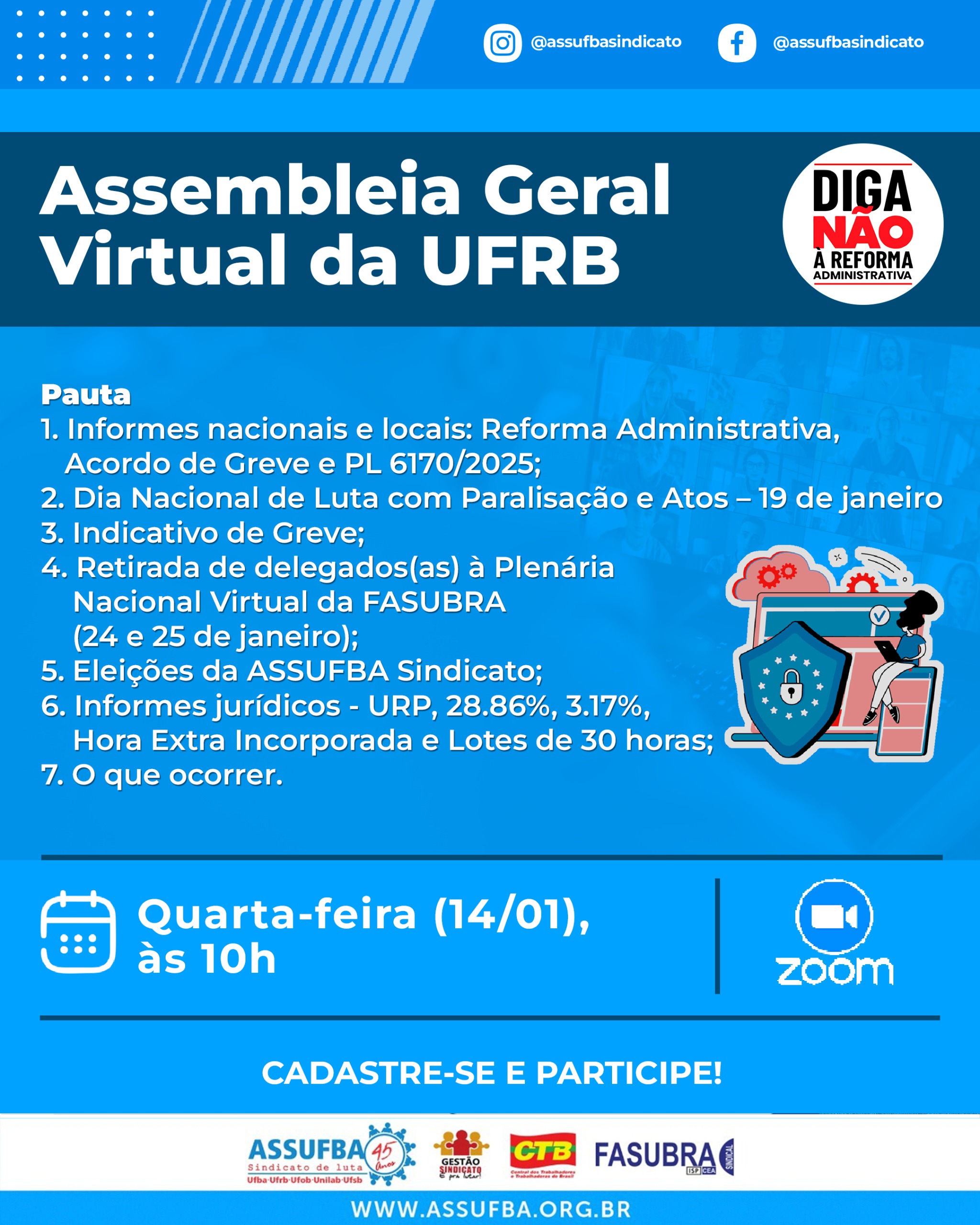 Os(as) servidores(as) da UFRB têm um encontro marcado com a ASSUFBA na quarta-feira (14/01), às 10h, quando acontece a Assembleia Geral Virtual. A participação dos(as) trabalhadores(as) é fundamental. O cenário