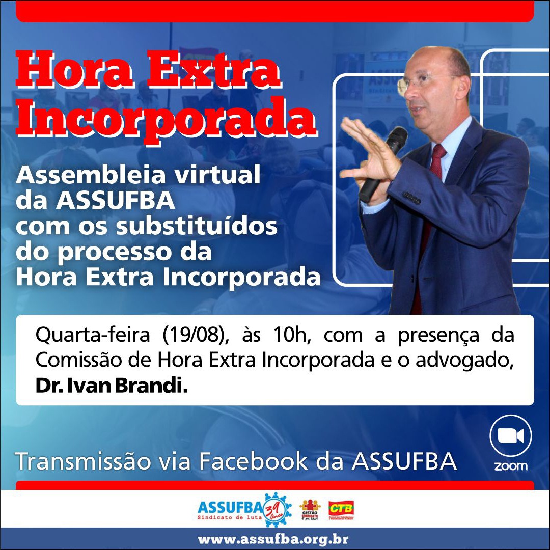 Os substituídos do processo da Hora Extra Incorporada têm um encontro marcado com a ASSUFBA nesta quarta-feira (19/08). Às 10h, tem assembleia virtual com a presença da Comissão de Hora Extra Incorporada e o advogado, Dr. Ivan Brandi. O Sindicato vai transmitir a atividade pelo Facebook.