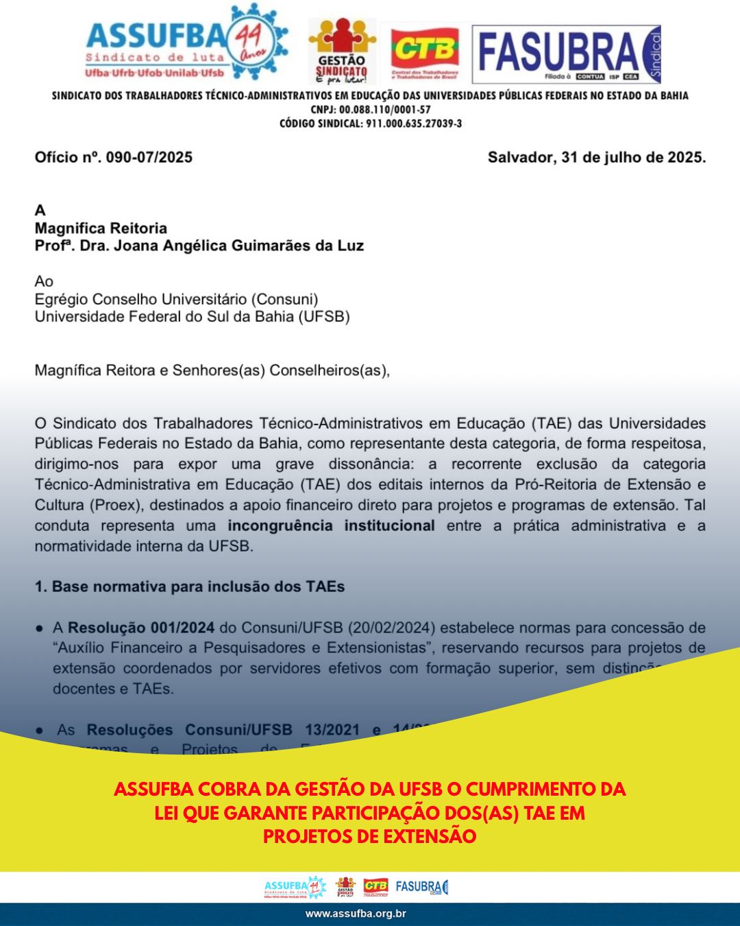 A ASSUFBA protocolou um documento junto à Reitoria e ao Consuni (Conselho Universitário) da Universidade Federal do Sul da Bahia) cobrando a imediata adequação dos editais internos da Pró-Reitoria de Extensão e Cultura (Proex), que vêm sistematicamente excluindo os(as) Técnico(a)-Administrativos(as) em Educação da possibilidade de atuarem como Coordenadores(as) de projetos de extensão.