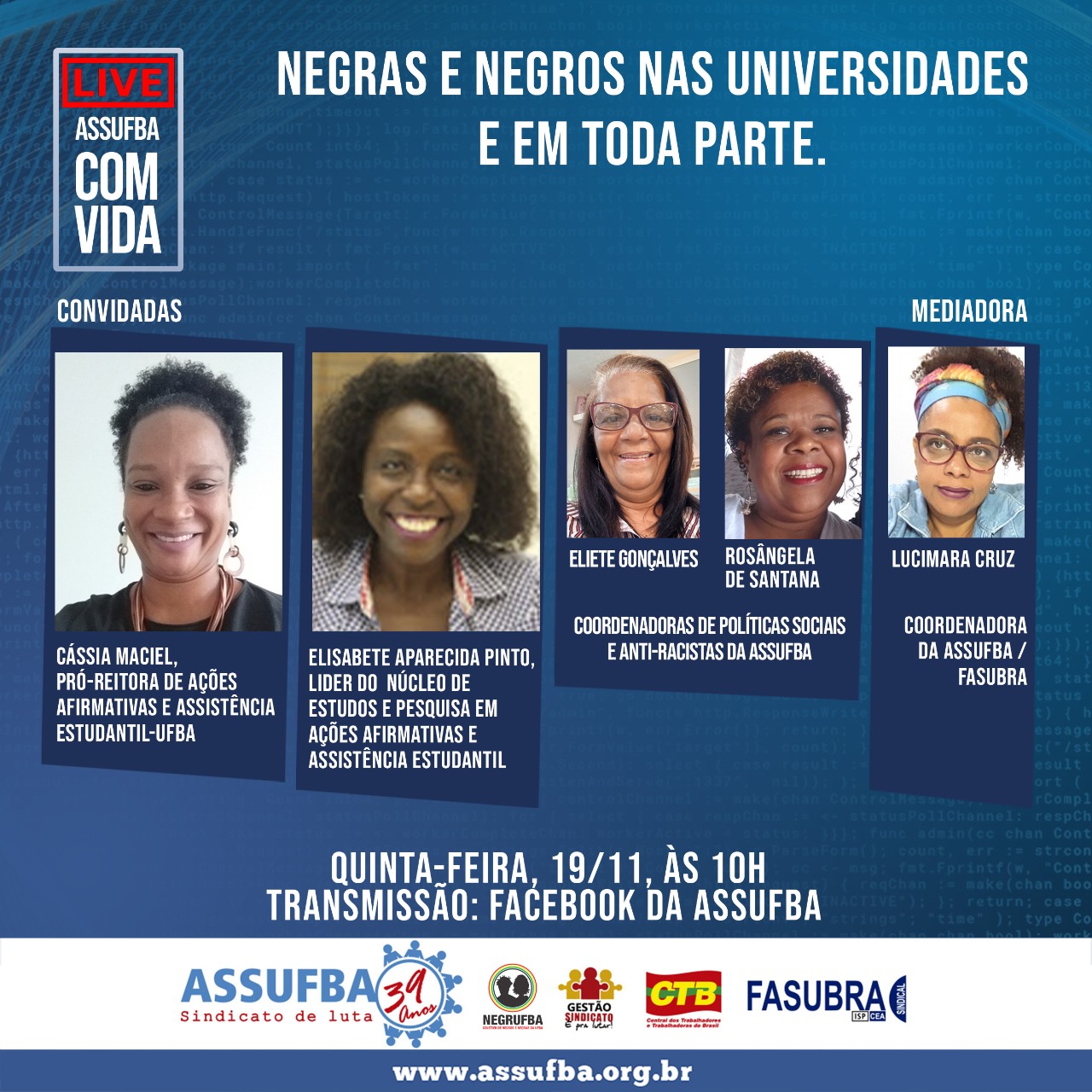 Para celebrar o Dia da Consciência Negra, comemorado em 20 de novembro, o Sindicato realiza, na quinta-feira (19/11), às 10h, mais uma edição do ASSUFBA Com Vida. Como o tema “Negras e Negros nas universidades e em toda parte”, o evento virtual começa às 10h e será transmitido pelo Facebook da entidade.