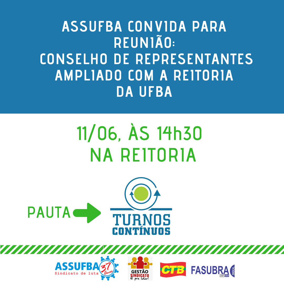 A ASSUFBA convida o Conselho de Representantes das Unidades Ampliado com a Reitoria da UFBA para reunião, na segunda-feira (11/06), às 14h30, na Reitoria. Na pauta, Turnos Contínuos. A participação dos representantes das unidades, portanto, é fundamental.