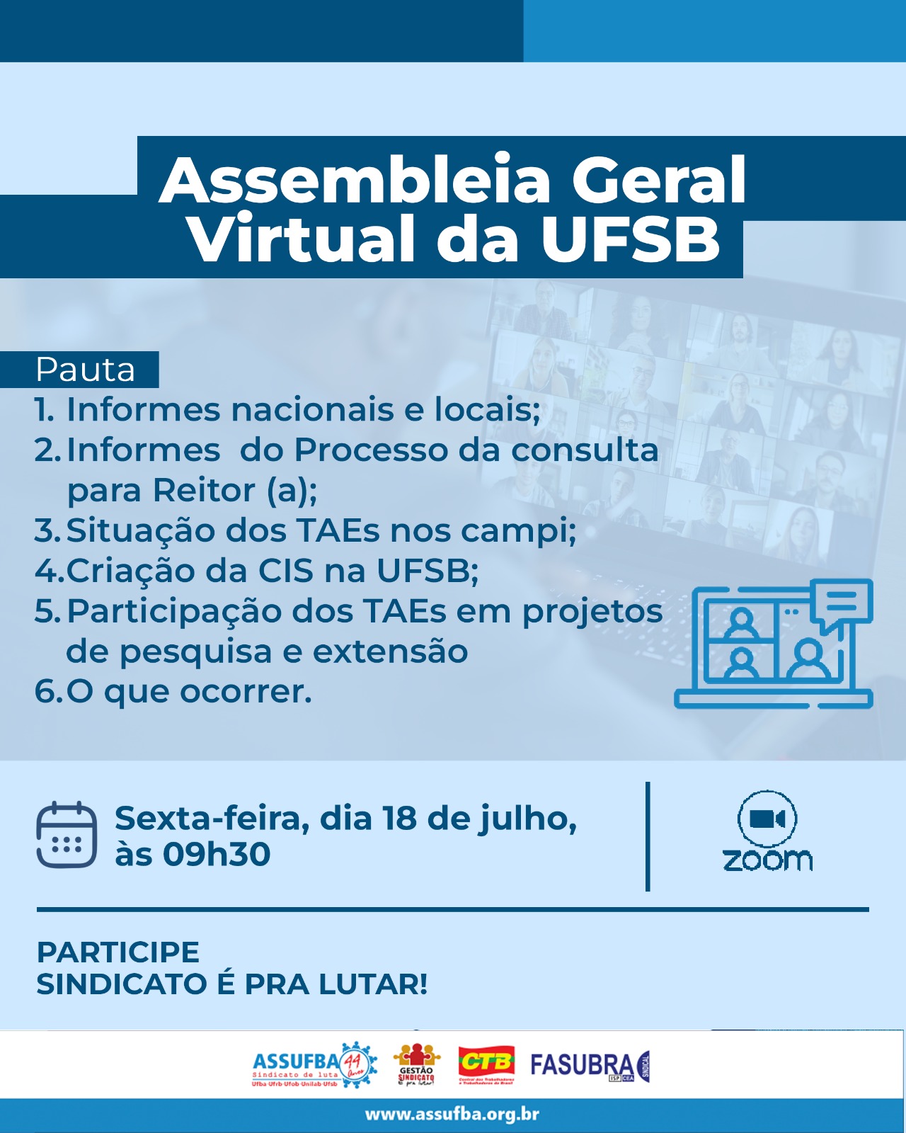 A ASSUFBA convoca todos(as) os(as) servidores(as) Técnico-Administrativos em Educação (TAEs) da Universidade Federal do Sul da Bahia (UFSB) para participarem da Assembleia Geral, que será realizada na próxima sexta-feira, 18 de julho, às 9h30, por meio da plataforma Zoom.