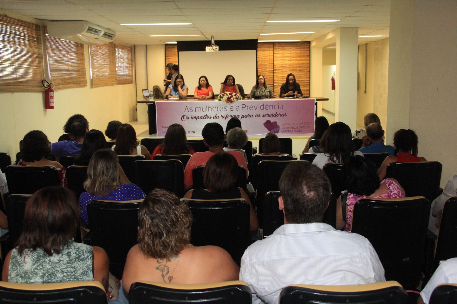Com o objetivo de discutir e explicar como a reforma da Previdência afetará diretamente as mulheres, a mesa do debate foi composta pelas coordenadoras gerais, Aida Maia e Simone Leal; a coordenadora de Políticas Sociais e Anti-racistas, Eliete Gonçalves; a Pró-reitora Cassia Virgínia, representando o reitor da UFBA, João Carlos Salles. O evento contou também com a presença da deputada federal Alice Portugal.