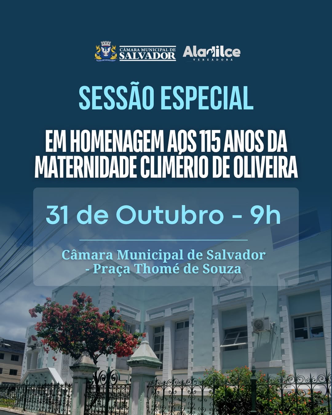 A ASSUFBA Sindicato marca presença, na manhã desta sexta-feira (31/10), às 9h, na Sessão Especial em celebração aos 115 anos da Maternidade Climério de Oliveira. O evento acontece na Câmara Municipal de Salvador e é uma iniciativa da vereadora Aladilce Souza.