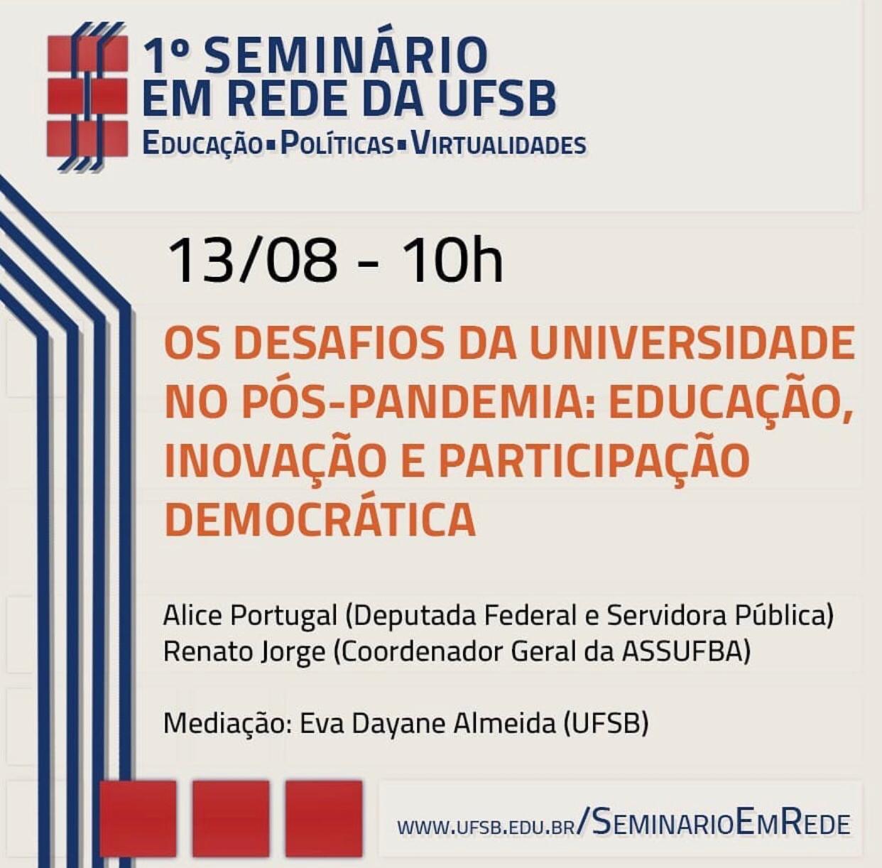 A ASSUFBA participa, nesta quinta-feira (13/08), do 1º Seminário em Rede da UFSB: Educação, Políticas, Virtualidades, evento que se propõe discutir e refletir, junto com a comunidade universitária, sobre as novas formas e sentidos do ensino superior.