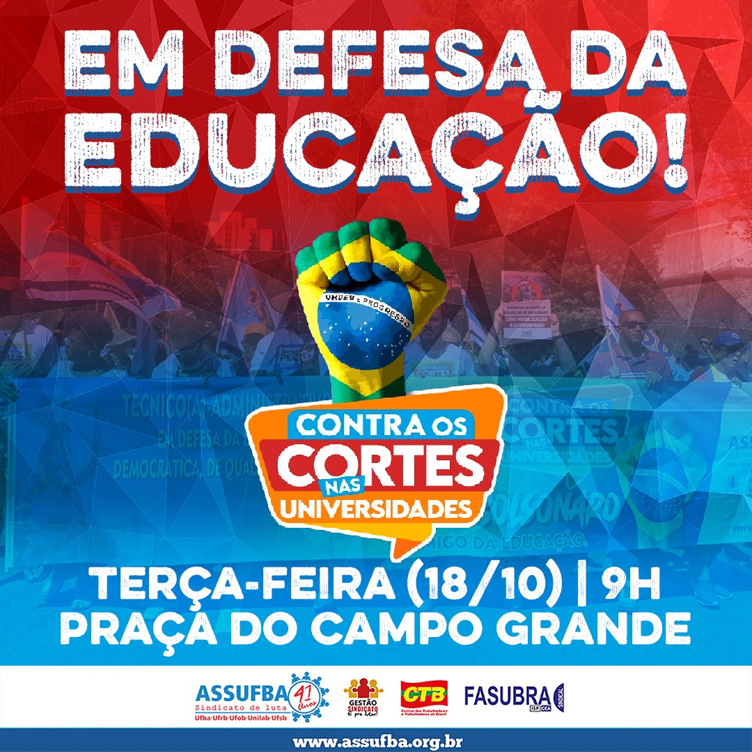 A mobilização em defesa da educação continua. Nesta terça-feira (18/10), a ASSUFBA novamente se junta aos estudantes para o grande Ato Nacional de Luta Contra o Confisco na Educação, defendendo a recomposição do orçamento das universidades e institutos federais, cortado por Bolsonaro.