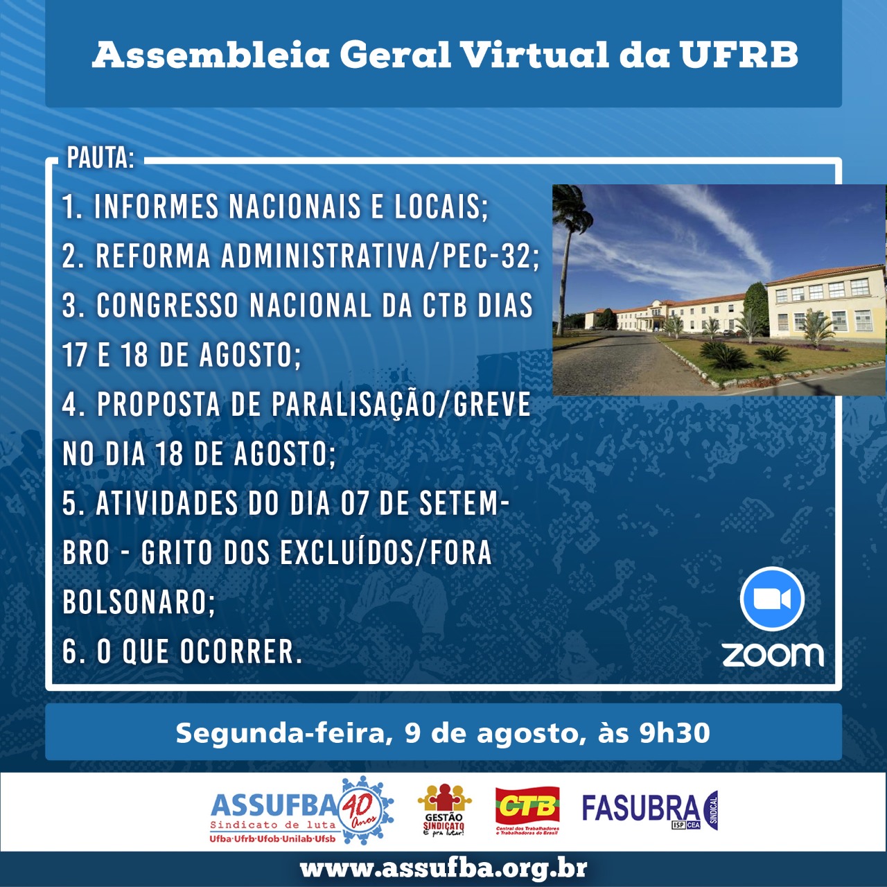 Na segunda-feira (09/08), às 9h30, a ASSUFBA realiza Assembleia Geral Virtual. A Coordenação do Sindicato e a categoria vão discutir, entre outras coisas, a Reforma Administrativa e a proposta de paralisação/greve, no próximo dia 18. A sua participação é fundamental. Esperamos por você!