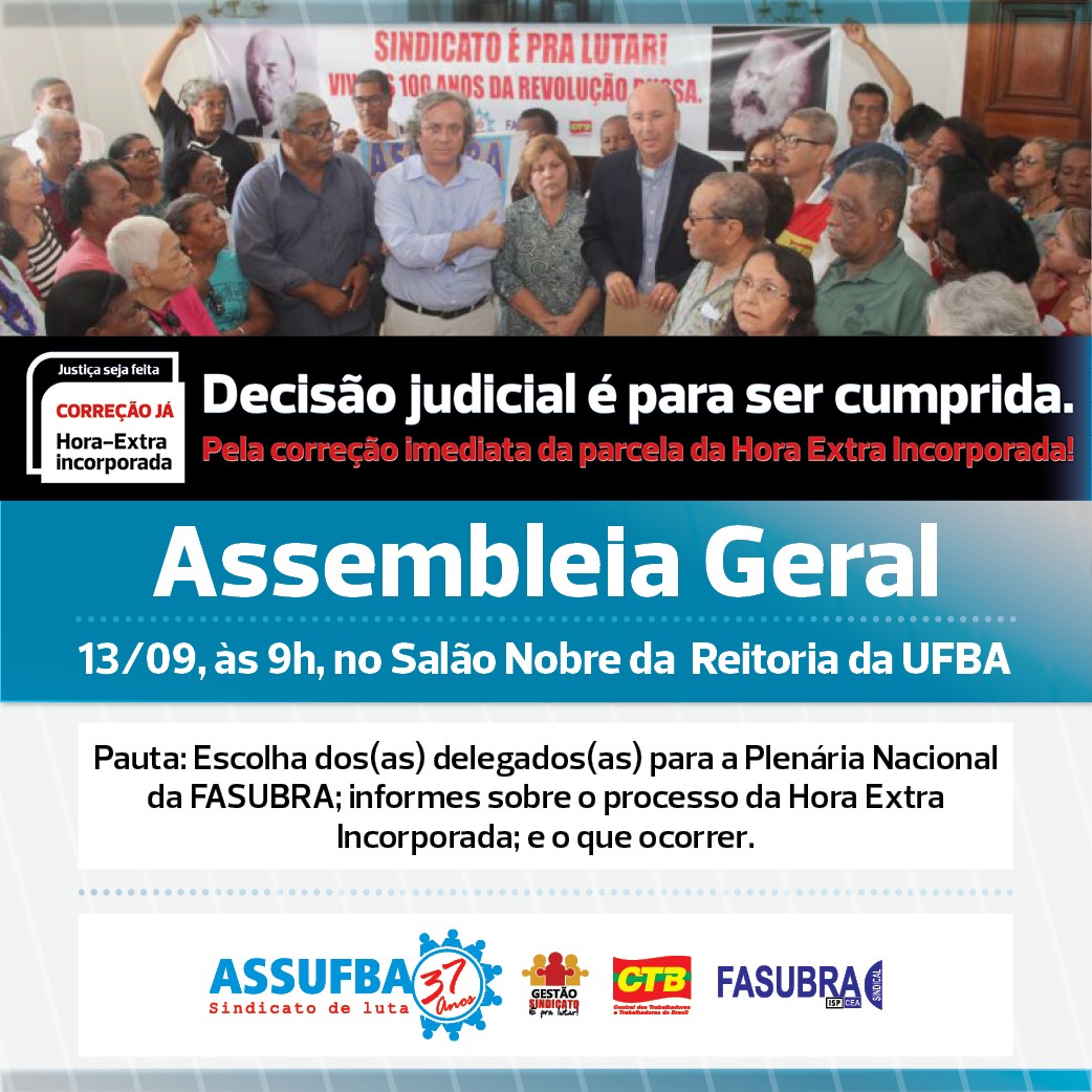 A ASSUFBA realiza Assembleia Geral no dia 13 de setembro, às 9h, no Salão Nobre da Reitoria da UFBA. Na pauta, o processo da Hora Extra Incorporada, com a presença do advogado do caso, Dr. Ivan Brandi; escolha dos(as) delegados(as) para a Plenária Nacional da FASUBRA; e o que ocorrer.