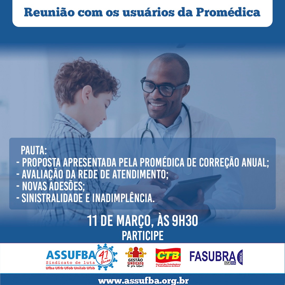 Nesta sexta-feira (11/03), às 9h30, a ASSUFBA realiza reunião virtual, pela plataforma Zoom, com os usuários da Promédica, para tratar da proposta apresentada pelo convênio sobre o índice de reajuste do plano de saúde.