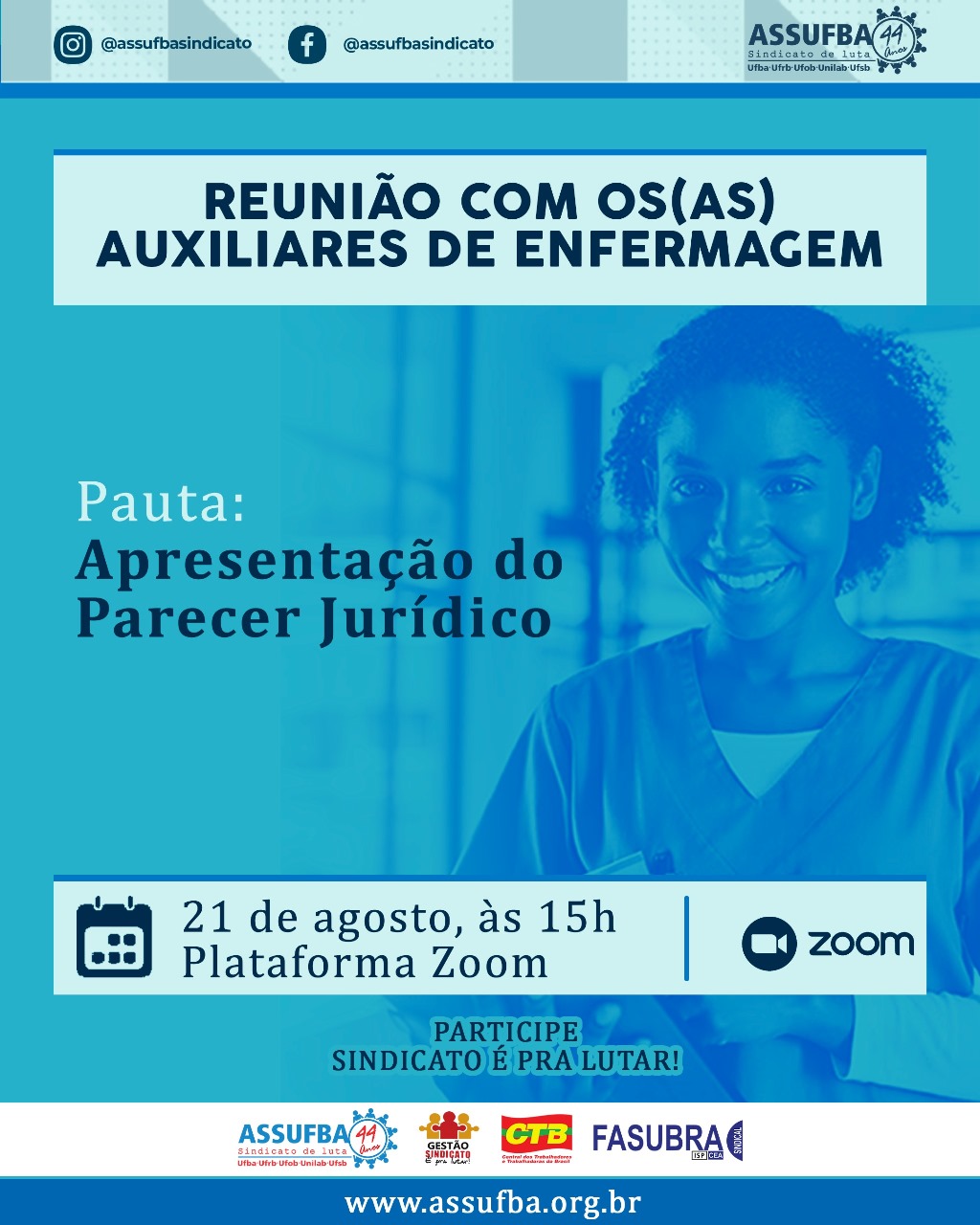 Nesta quinta-feira (21/08), às 15h, a ASSUFBA realiza reunião virtual com os(as) Auxiliares de Enfermagem.