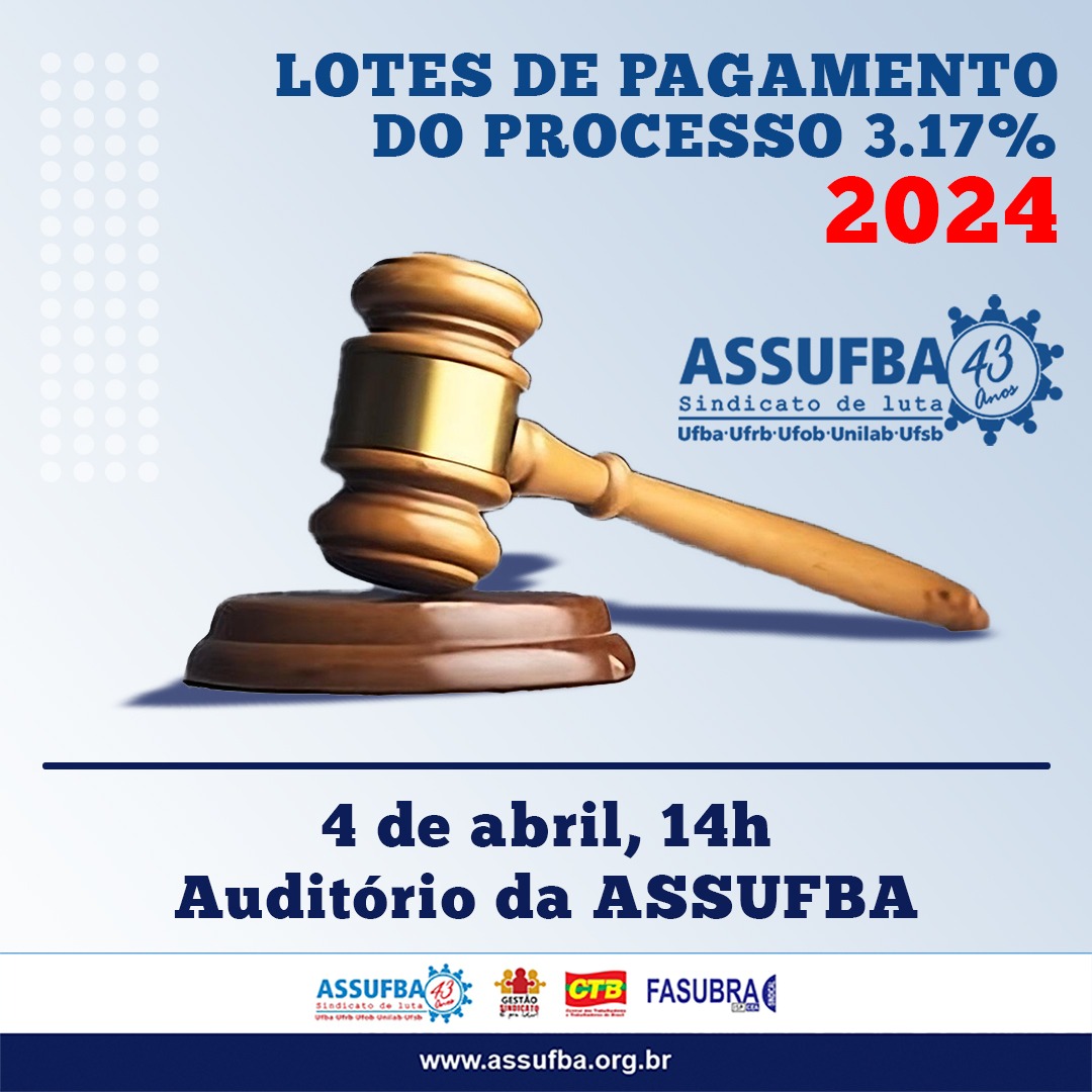 Como anunciado na última Assembleia Geral da UFBA (21/03), a ASSUFBA Sindicato convida os(as) contemplados de mais 12 lotes do Processo 3.17%, para uma reunião que acontece no dia 04 de abril, às 14h, no Auditório da ASSUFBA Sindicato.