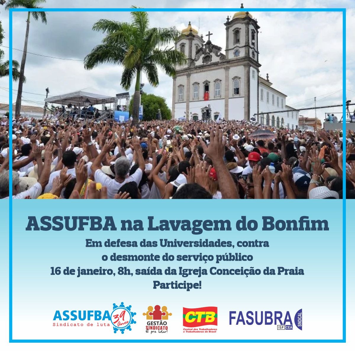 As celebrações para a Lavagem do Bonfim de 2020 serão realizadas no dia 16 de janeiro. A festa, uma das comemorações religiosas mais importantes da Bahia, espera contar com quase 2 milhões de pessoas. Como é de praxe, a ASSUFBA Sindicato está confirmada com toda sua categoria, para contemplar um dos maiores eventos de Salvador e do Brasil.