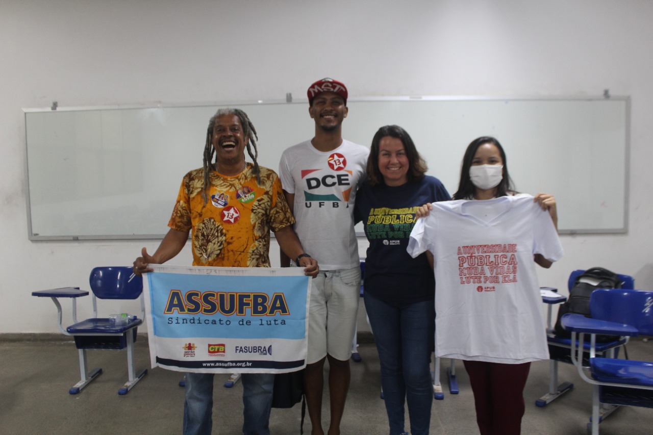 O Coordenador de Comunicação Antônio Bomfim Moreira representou toda a categoria de técnico(a)-administrativos(as). Para completar as vertentes que representam a comunidade, foram convidados à mesa também a professora e diretora financeira da APUB, Fernanda Almeida, e o representando DCE UFBA, Arlindo Pereira. A mediação ficou por conta da professora Luma Seixas.