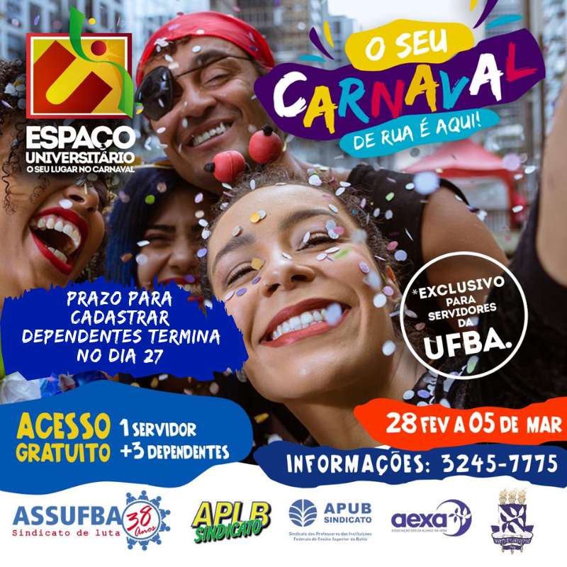 Quem ainda não garantiu lugar no Espaço Universitário, o local mais democrático do Carnaval de Salvador, deve se ligar. O servidor associado à ASSUFBA tem até esta quarta-feira (27/02) para cadastrar os dependentes.