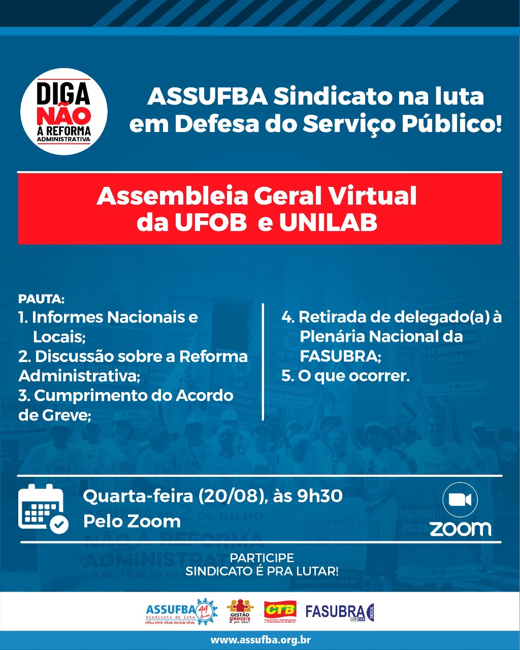 Atenção, servidores(as) da UFOB e UNILAB. Quarta-feira (20/08) tem Assembleia Geral Virtual