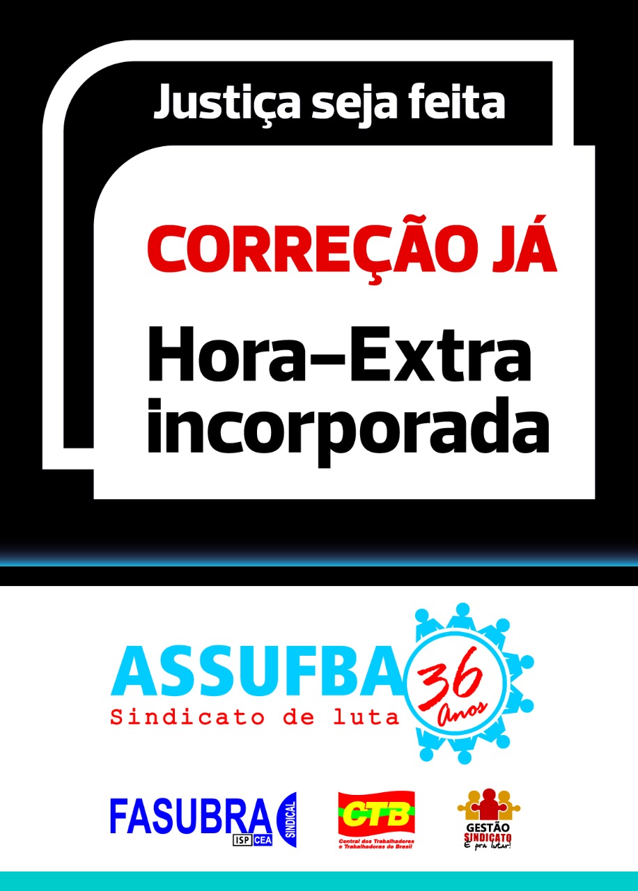 Os Técnico-Administrativos em Educação realizam, nesta quinta-feira (21/09), às 9h, em frente à Prodep, ato pela correção imediata da parcela da Hora Extra Incorporada. Isso porque a A AGU (Advocacia-Geral da União) suspendeu o Parecer de Força Executória, encaminhado para a UFBA no dia 13 de julho, que determinava à Universidade que procedesse com o reajuste das parcelas das “Horas Extras Incorporadas” em favor de todos os substituídos, nos termos das decisões contidas no despacho do Dr. Wilson Alves de Souza, Juiz Federal em Exercício na 3ª Vara Cível/SJBA.