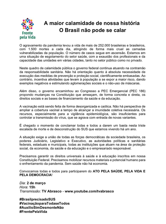Na nota, a Frente que reúne várias entidades e organizações sociais, convocou também a população para um ato virtual que acontece nesta terça-feira (02/03) , às 15h. Confira a nota: