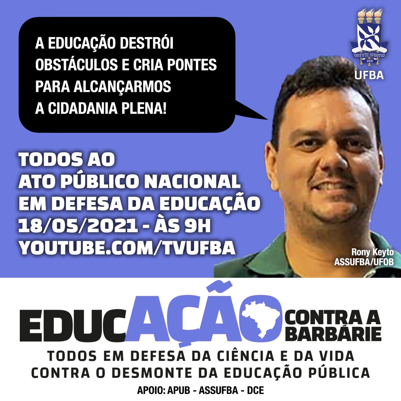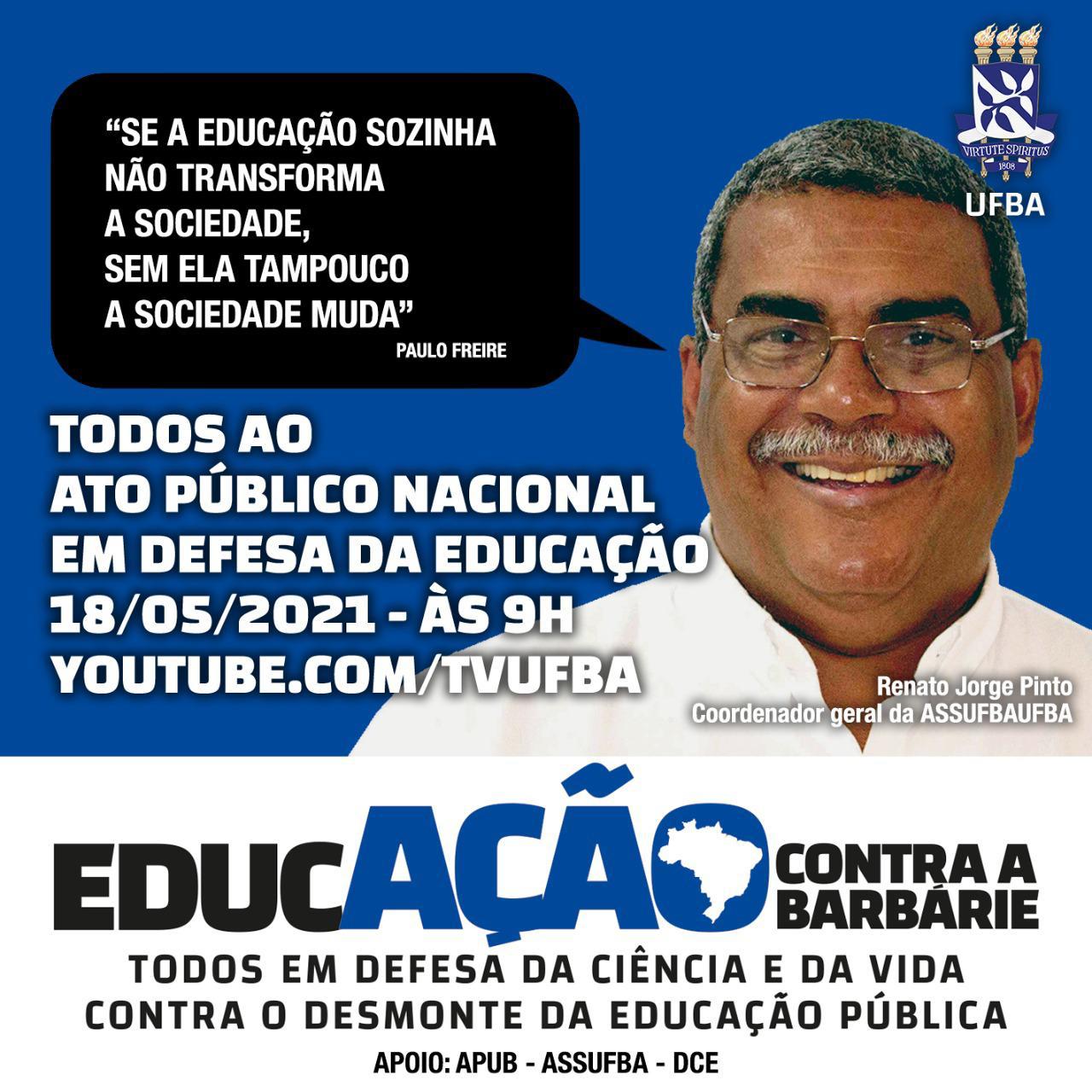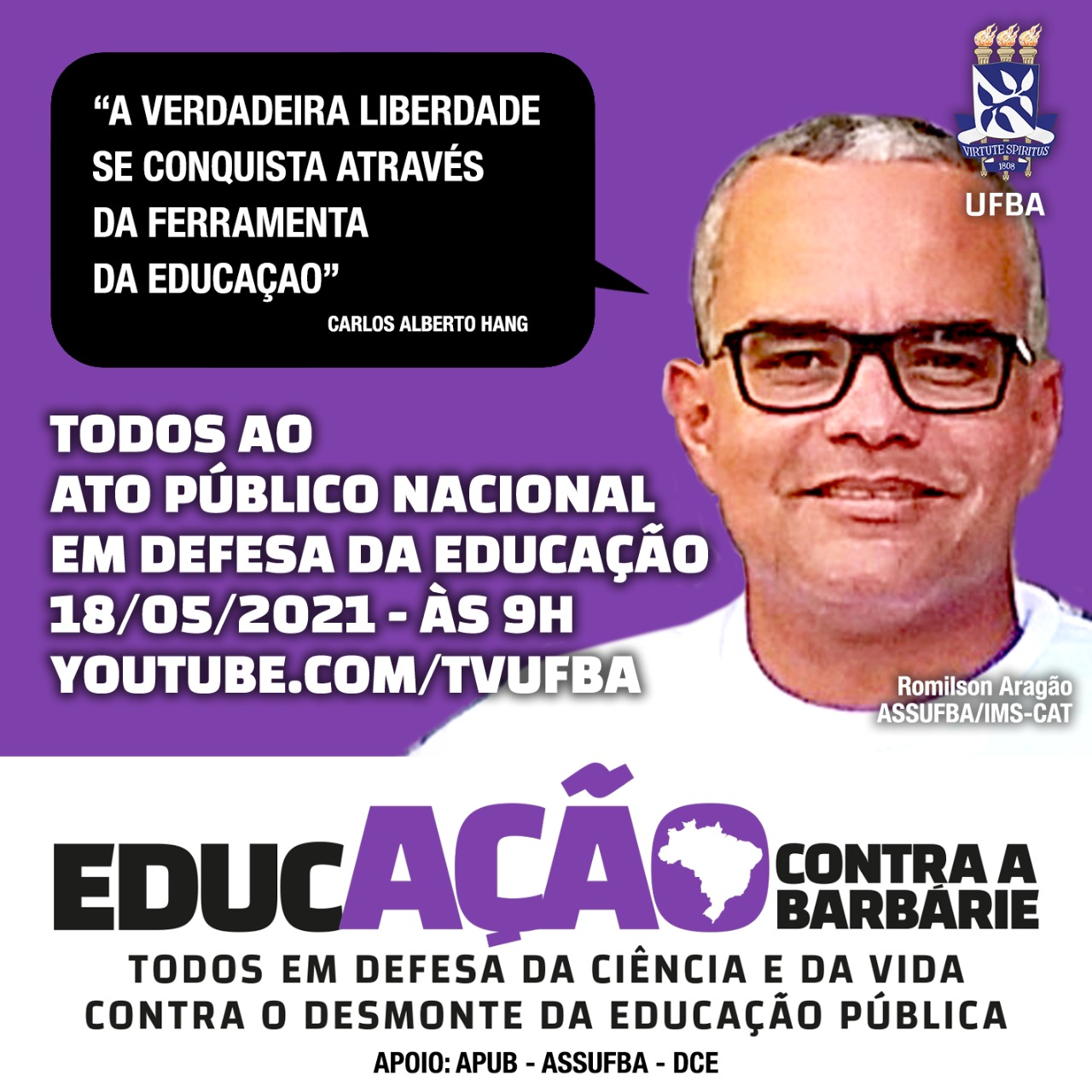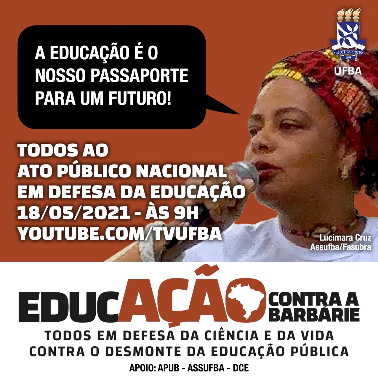 Nesta terça-feira (18/05) acontece o Ato Público Nacional em Defesa da Educação, às 9h. O movimento será transmitido pelo canal do Youtube da TV UFBA. A ação, em defesa da vida e da ciência, é organizada pela Universidade Federal da Bahia (UFBA) e conta com a parceria entre a ASSUFBA, APUB e o DCE.