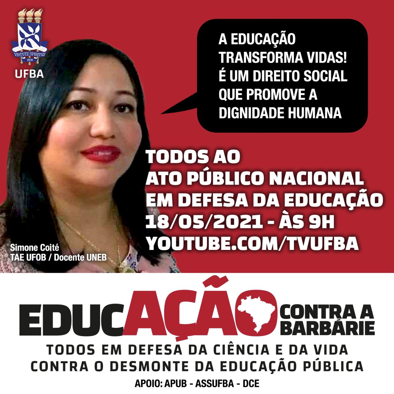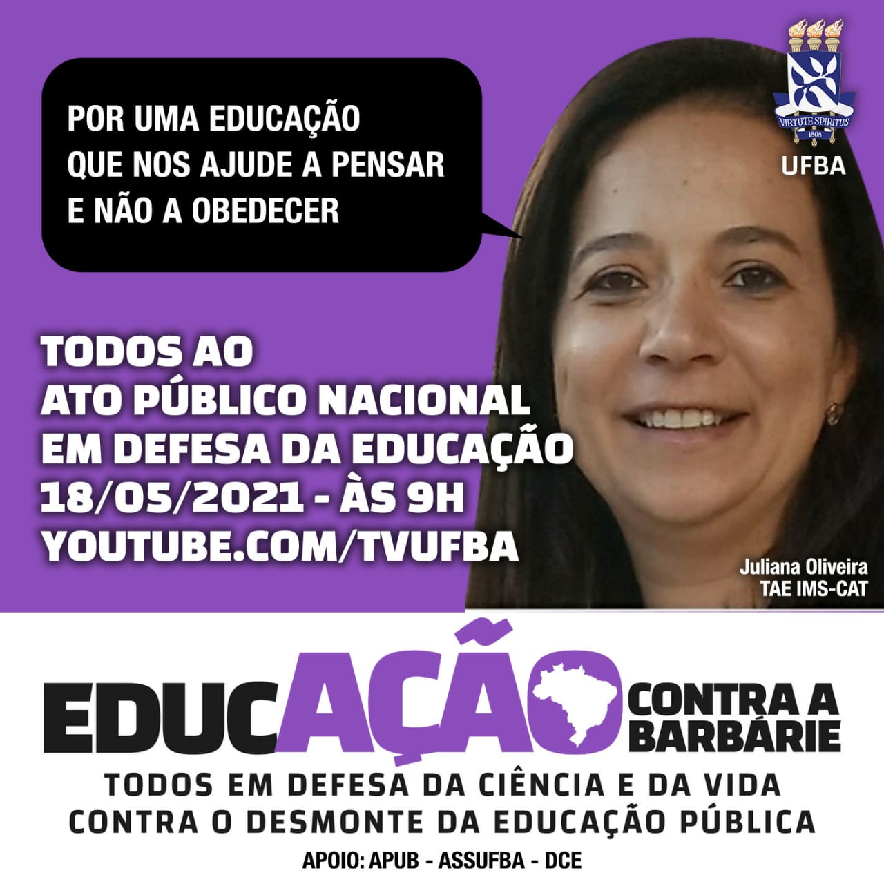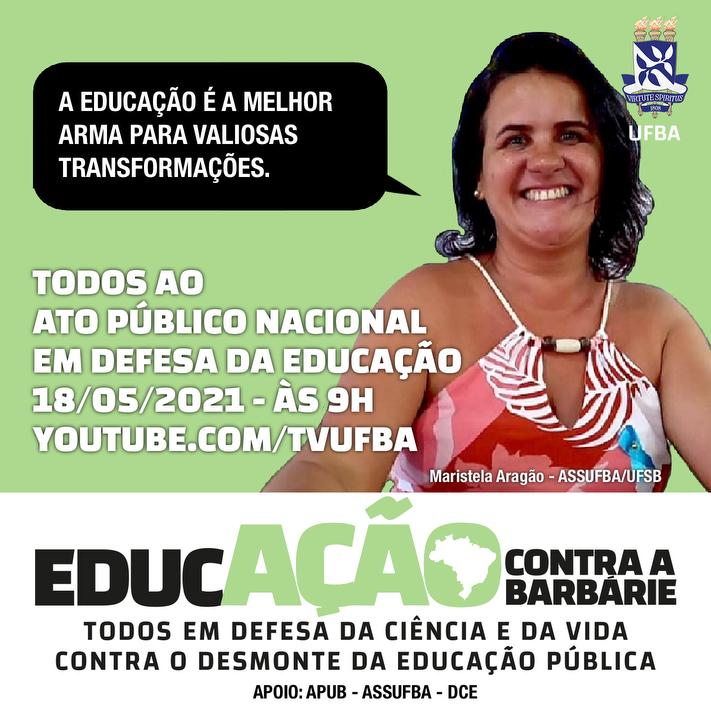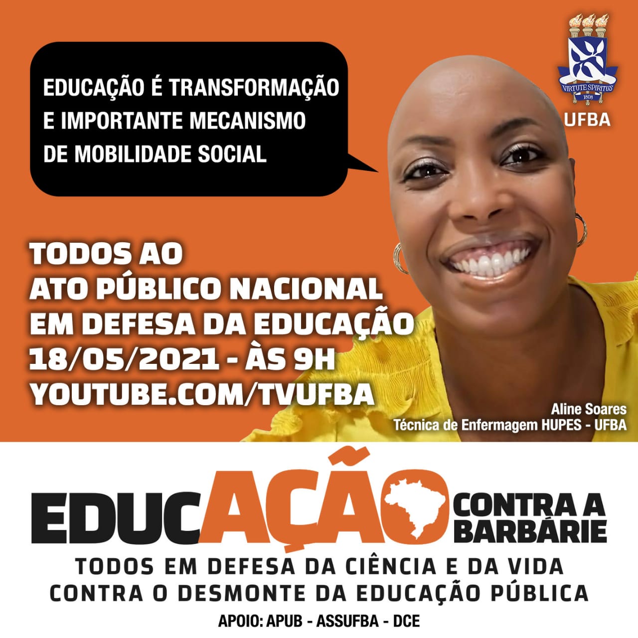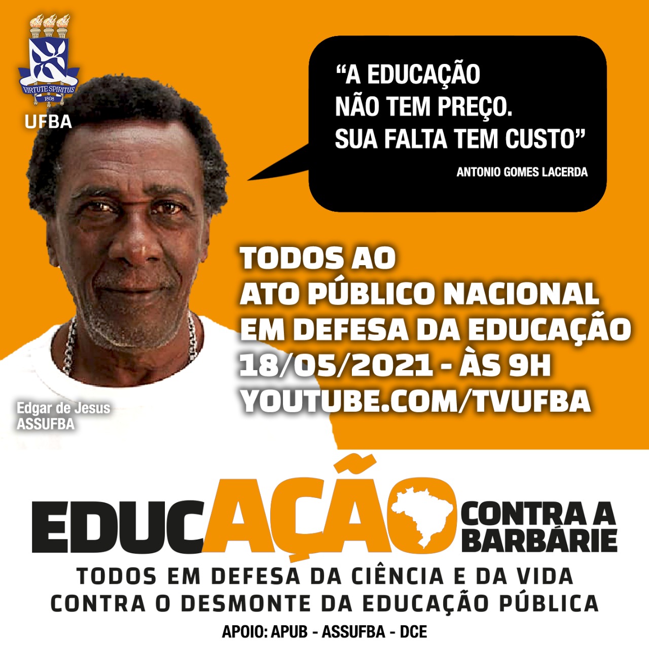 Nesta terça-feira (18/05) acontece o Ato Público Nacional em Defesa da Educação, às 9h. O movimento será transmitido pelo canal do Youtube da TV UFBA. A ação, em defesa da vida e da ciência, é organizada pela Universidade Federal da Bahia (UFBA) e conta com a parceria entre a ASSUFBA, APUB e o DCE.