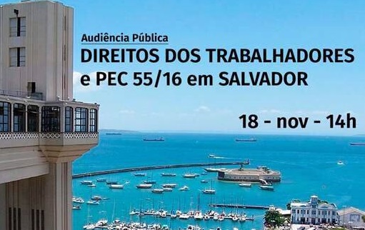 Para falar sobre os direitos dos trabalhadores e sobre a PEC 55/16, será realizado nesta sexta-feira (18/11) uma audiência pública, no auditório da Faculdade de Arquitetura da UFBA, no bairro da Federação, em Salvador, às 14h.