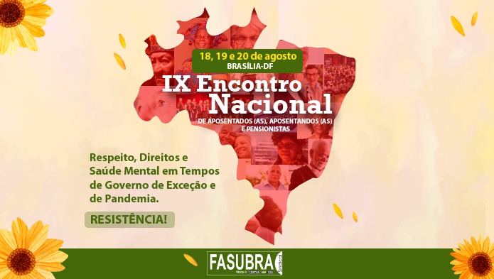 O IX Encontro Nacional de Aposentados(as), Aposentados(as) e Pensionistas, realizado pela FASUBRA, começa nesta quinta-feira (18/08) e segue até este sábado (20/08). O tema do evento é “Respeito, Direitos e Saúde Mental em tempos de Governo de Exceção e de Pandemia”.
