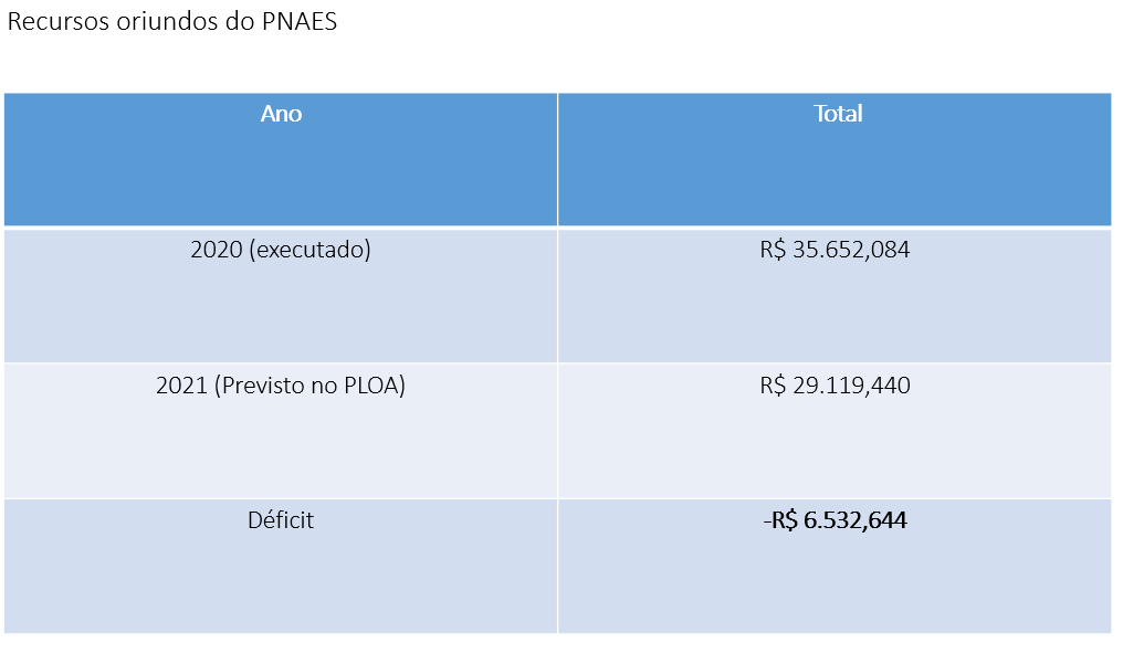 O corte previsto para o conjunto das Ifes é de R$ 1,17 bilhões, pouco mais de 18%. Em 2020, as Ifes tiveram orçamento de R$ 5,54 bilhões; para 2021, o PLOA prevê R$ 4,36 bilhões. O Programa Nacional de Assistência Estudantil (Pnaes), incluso nesse montante, deverá receber R$ 250 milhões a menos, caindo de R$ 1,05 bilhão, em 2020, para R$ 800 milhões, neste ano.