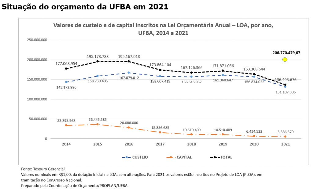 O possível agravamento da crise orçamentária vivida pela UFBA foi reiterado ao Conselho Universitário pelos dois pró-reitores, na reunião do dia 15 de março. Em agosto do ano passado, quando o PLOA para 2021 foi anunciado, a Administração Central expôs à comunidade universitária a gravidade da situação. A Reitoria buscou articulação com parlamentares, a fim de garantir recursos extras, tendo obtido da bancada baiana uma emenda para custeio de água e energia elétrica das universidades do Estado – uma ação importante, mas que não assegura que os recursos serão efetivamente liberados pelo governo federal.