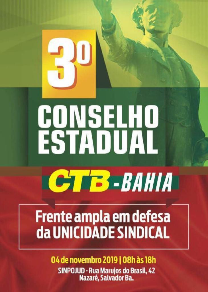 No dia 4 de novembro, a CTB-BA (Central dos Trabalhadores e Trabalhadoras do Brasil) realiza o 3° Conselho Estadual com o tema “Frente Ampla em defesa da UNICIDADE SINDICAL”.