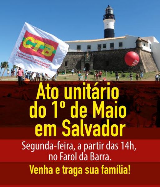 A CTB Bahia está convocando todos os sindicatos, dirigentes classistas e trabalhadores de Salvador para o ato unificado de celebração do Dia do Trabalhador, 1º de Maio, que este ano será realizado no Farol da Barra, a partir das 14h, com a participação de lideranças sindicais, políticas e dos movimentos sociais.