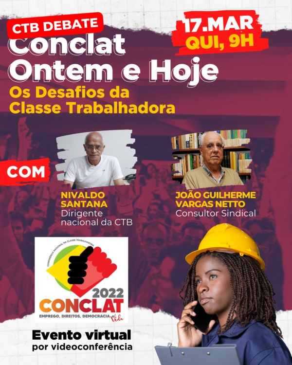 O seminário “Conclat Ontem e Hoje – Desafios da Classe Trabalhadora”, que está sendo organizado pela Central dos Trabalhadores e Trabalhadoras do Brasil (CTB), acontece nesta quinta-feira (17/03), e terá participação do consultor sindical, João Guilherme Vargas, e do dirigente nacional da CTB, Nivaldo Santana.