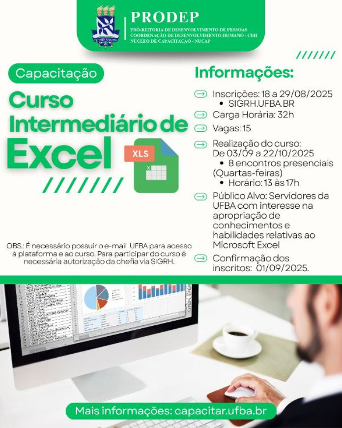 A PRODEP (Pró-Reitoria de Desenvolvimento de Pessoas) está oferecendo o curso Intermediário de Excel destinado para todos os(as) servidores(as) Técnico(a)-Administrativos(as) da UFBA com interesse na apropriação de conhecimentos e habilidades relativas ao Microsoft Excel, com total de 15 vagas.