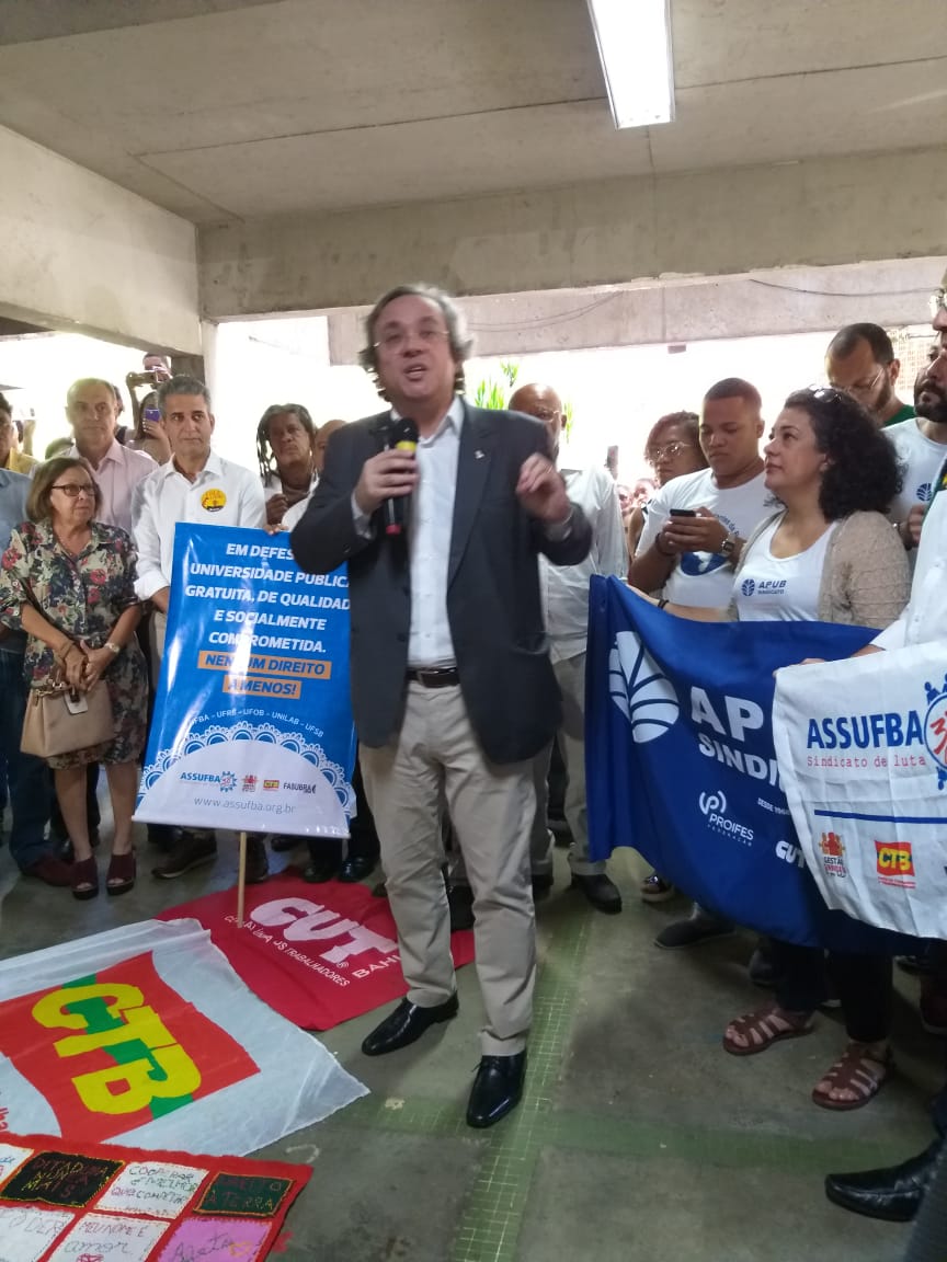 O reitor da UFBA, João Carlos Salles, participou do ato, assim como o vice-reitor Paulo Miguez, e informou dados sobre o bloqueio das verbas, que custeiam, por exemplo, gastos de água, luz, limpeza. O corte atinge aproximadamente 40 mil alunos. “Para as universidades já combalidas é uma sentença de distribuição”.