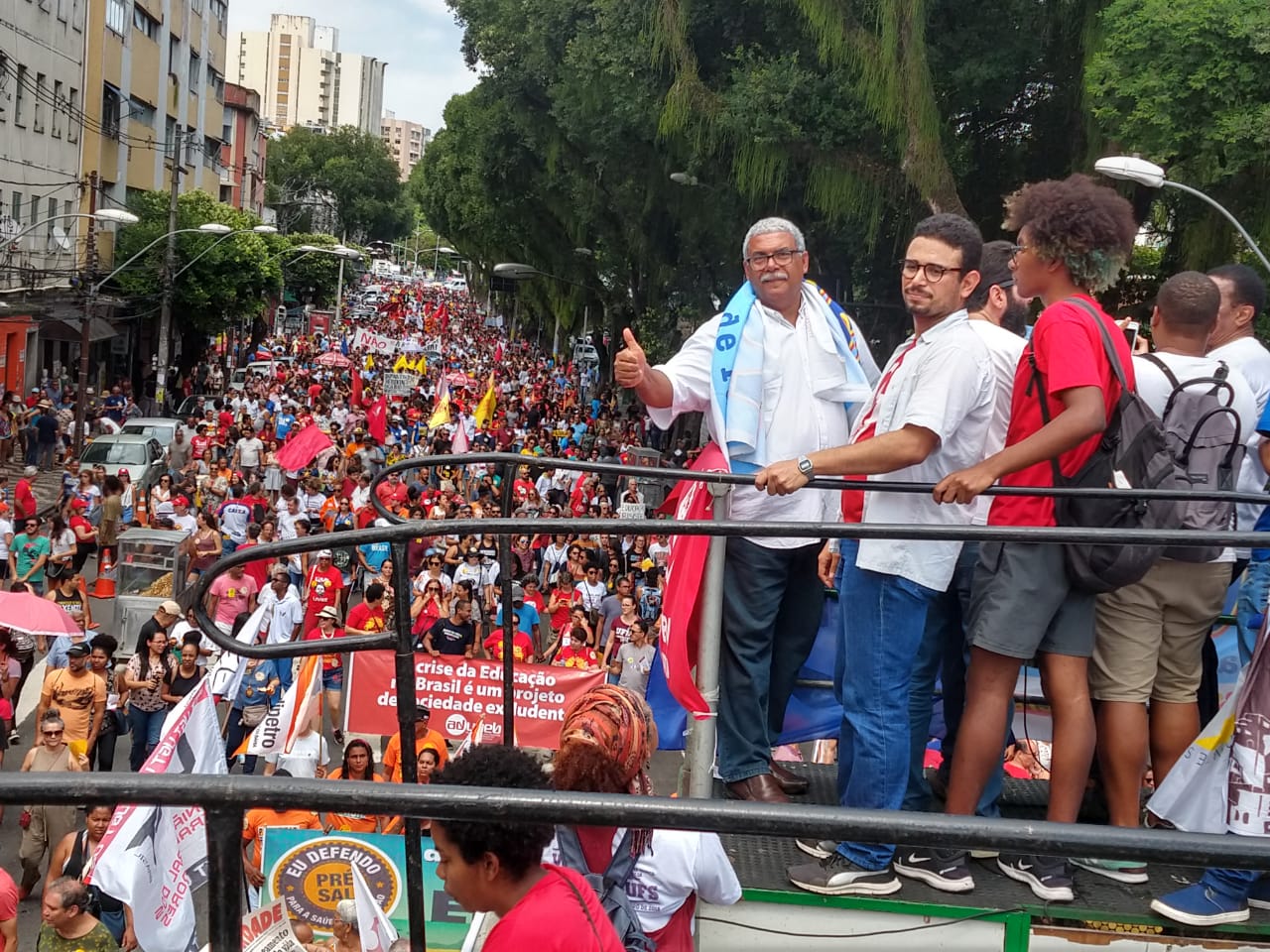 Presente no ato, a deputada federal e servidora licenciada da UFBA, Alice Portugal, exclamou que “nós estamos de pé e vamos reagir a esses ataques às universidades. É o maior corte no setor da educação na história do país”. Sobre o Future-se, a parlamentar denunciou que o governo pretende transformar as instituições em “grandes consultorias privadas”.