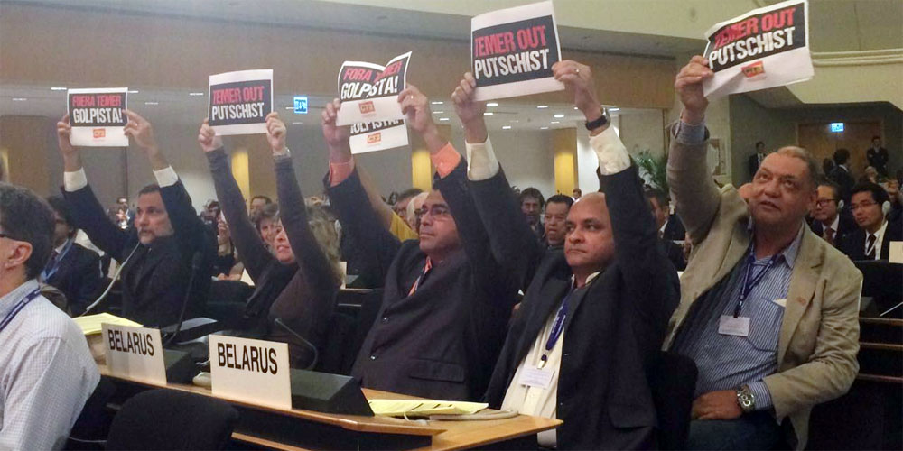De acordo com os sindicalistas, “os debates e discussões prosseguem em todas as outras comissões quando organizações e governos caracterizam, como nós, o golpe em nosso país. De plantão, a representação governamental brasileira apela para direitos de respostas, mesmo que antirregimentais”.