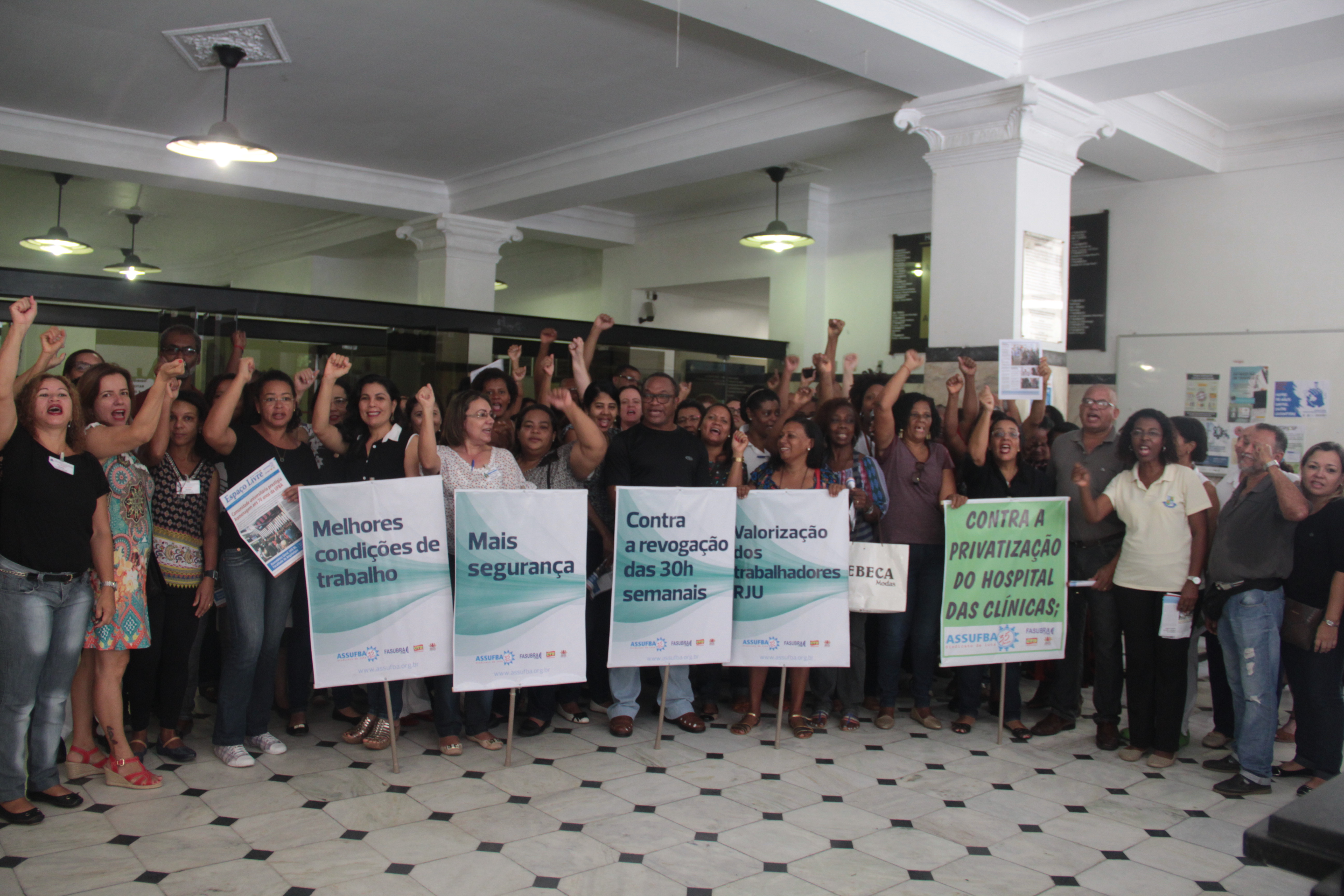 Durante todo o dia, os técnico-administrativos se concentraram no saguão do Hupes, quando apresentaram suas reivindicações e a situação atual da unidade, chamando atenção para a falta de material, de condições de trabalho e segurança, além da importância em valorizar os trabalhadores RJU e combater o assédio moral entre trabalhadores.