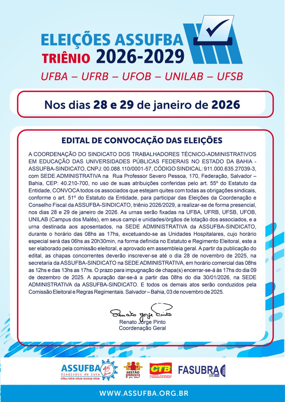 As eleições para a Coordenação da ASSUFBA Sindicato e o Conselho Fiscal, para o triênio 2026–2029, acontecem nos dias 28 e 29 de janeiro de 2026.