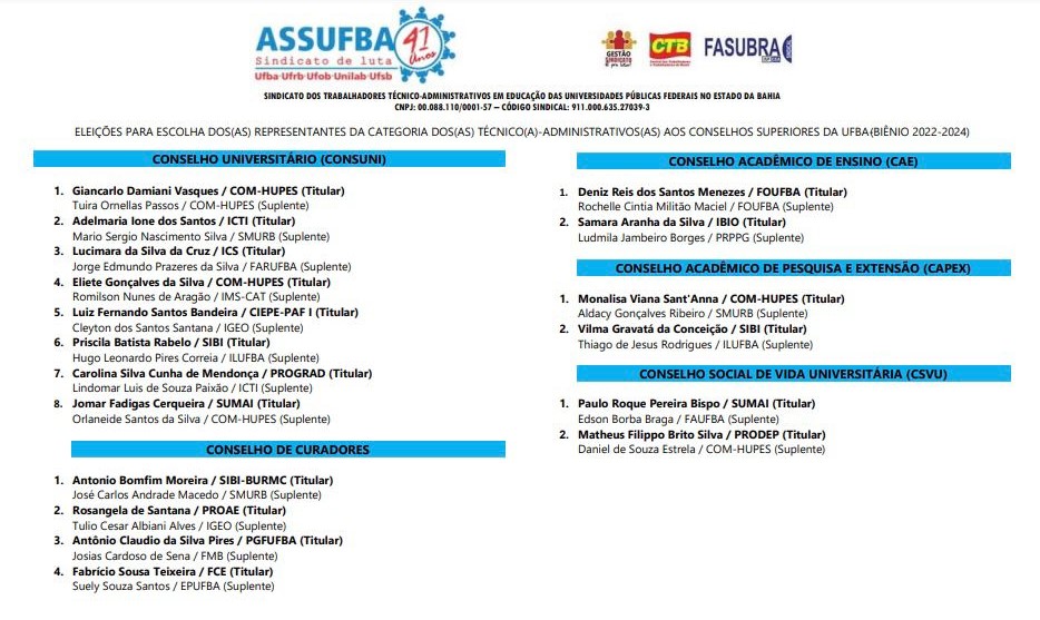 As eleições para escolha dos(as) representantes dos(as) Técnico(a)-Administrativos(as) em Educação nos Conselhos Superiores da UFBA (biênio 2022-2024) acontecem nos dias 3 e 4 de agosto.