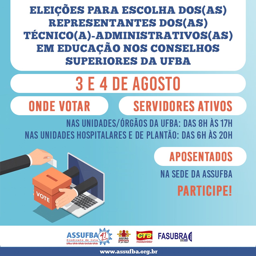 Os(as) servidores(as) ativos(as) podem votar nas Unidades/Órgãos da UFBA, das 8h às 17h, e nas unidades hospitalares, das 6h às 20h. Já os(as) aposentados(as) votarão na sede da ASSUFBA, das 8h às 17h.