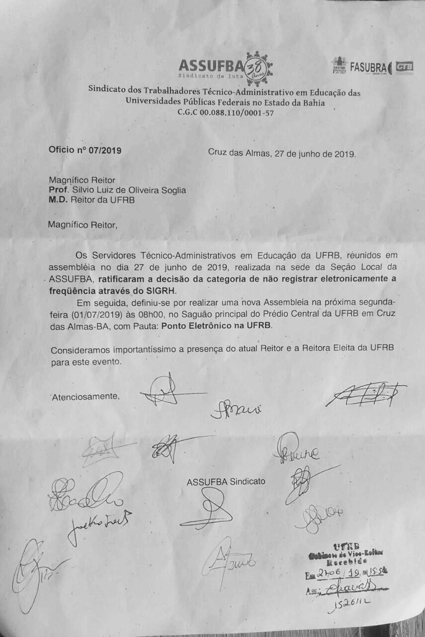 Reunidos em assembleia, nesta quinta-feira (27/06), realizada na sede da Seção Local da ASSUFBA, os Técnico-Administrativos em Educação da UFRB, ratificaram a decisão da categoria de não registrar eletronicamente a frequência através do SIGRH.