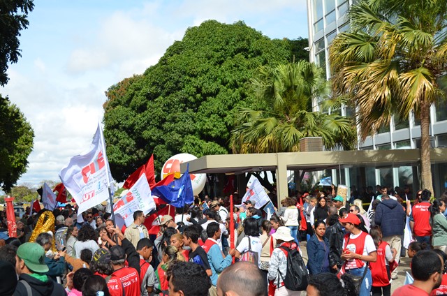 O Ato Nacional pelo fortalecimento da luta “contra o desmonte do MEC; em protesto ao programa ´Uma Ponte para o Futuro`, do governo golpista de Michel Temer; privatização da educação básica e superior; desvinculação das receitas do petróleo para educação e saúde; contra a Desvinculação de Receitas da União (DRU), e pelo Fora Temer”, realizado na manhã de quarta-feira, 29, reuniu cerca de mil pessoas, entre trabalhadores da área da educação e estudantes, em frente ao Ministério da Educação (MEC) em Brasília – DF.