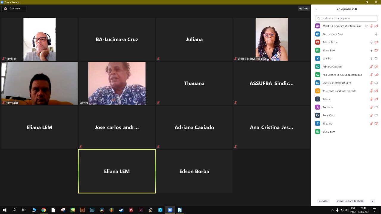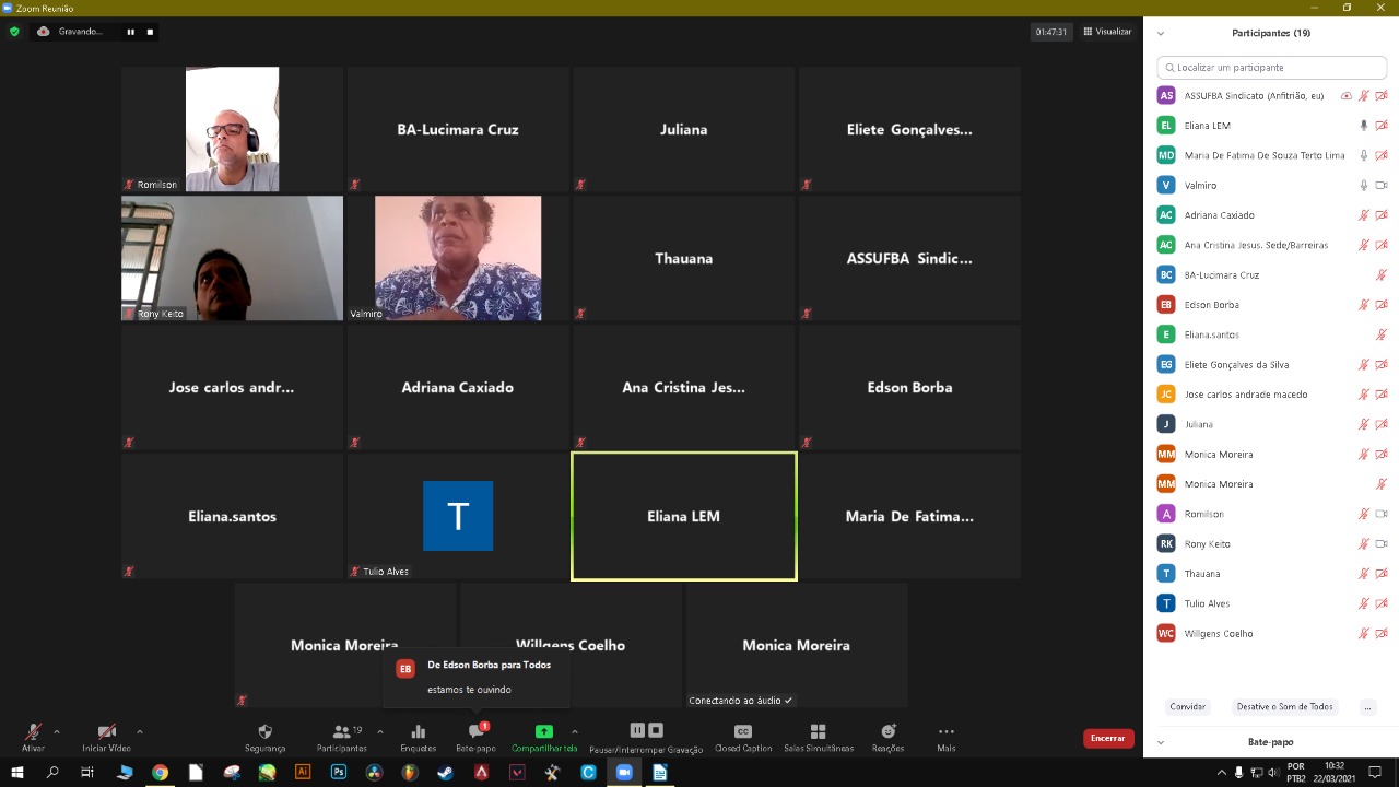 Entre os temas debatidos, os participantes discutiram o retorno às atividades presenciais com as aulas híbridas, a falta do adicional de insalubridade, as solicitações dos professores a respeito da presença dos técnicos em sala de aula e aos finais de semana. Também foi discutido o plano de contingenciamento da UFOB e a deficiência do corpo de trabalhadores de apoio para atuar no proposto retorno de atividades presenciais.
