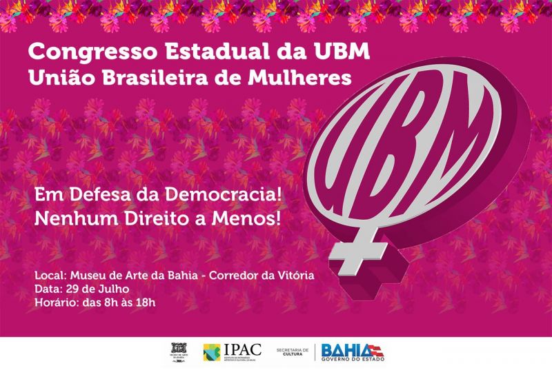 Neste sábado (29/07), acontece o Encontro Estadual da União Brasileira de Mulheres (UBM), preparatório para o 10º Congresso Nacional da UBM, que acontecerá em Salvador entre 4 e 6 de agosto de 2017. O evento será das 8h às 18h, no Museu de Arte da Bahia (MAB), na avenida Sete de Setembro, no Corredor da Vitória, em Salvador.